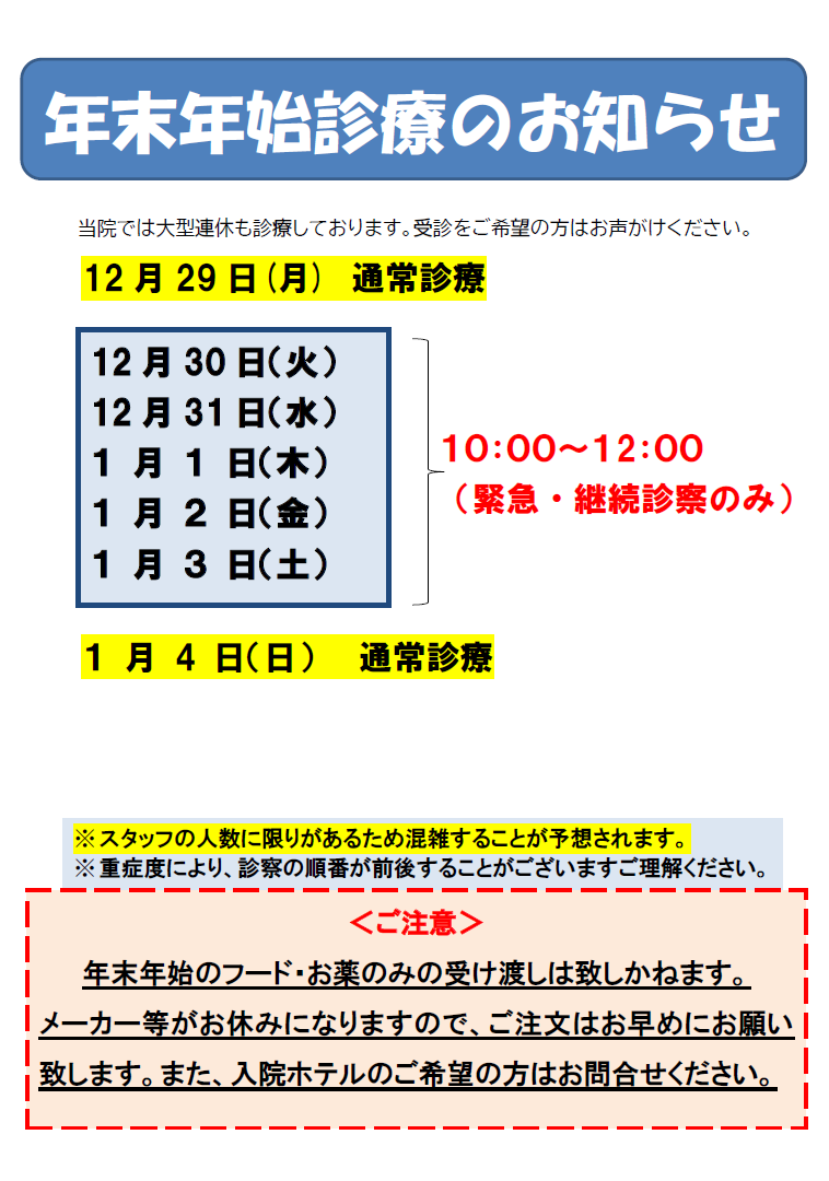 12月30日(火)~1月3日(土)は午前10時~12時まで特別診療となります。