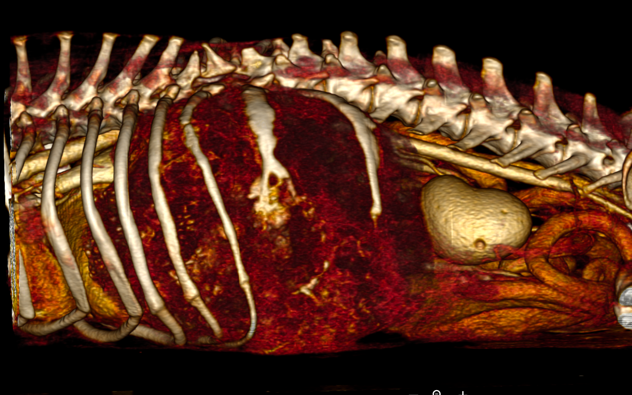 具体的には腫瘍の形状・大きさ、転移の有無、結石の有無、異物の有無など様々な病態に使用され、現在の獣医療に欠かせない診断ツールの一つになっております。また手術経過を立てる際に3D画像も撮影することができ、より安全に手術を行うことが可能となります。